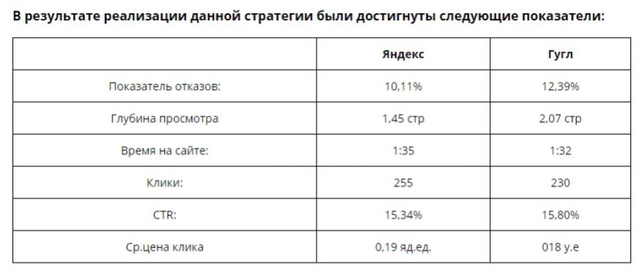 Достичь таких показателей мы планируем за счёт регулярного мониторинга данных аналитики (запросы пользователей, показатели отказов, среднее время нахождения посетителей на сайте, коэффициент конверсии для каждого типа рекламной кампании) и оптимизации показов рекламных объявлений на тематических площадках.