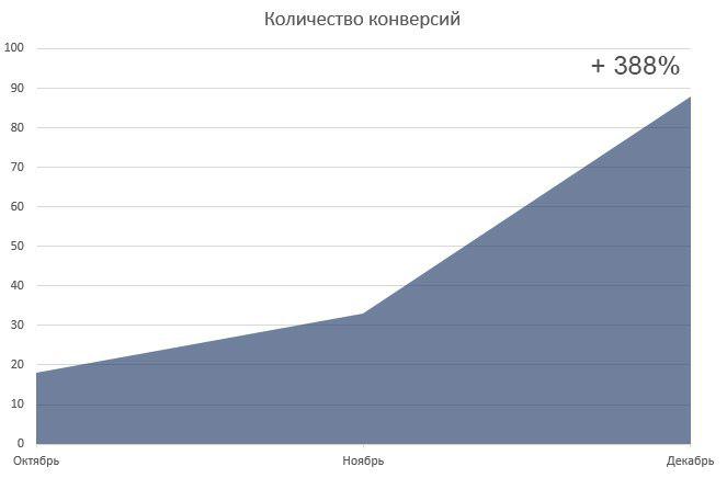 | Количество конверсий* | 18 | 33 | 88 | + 388,9% |
